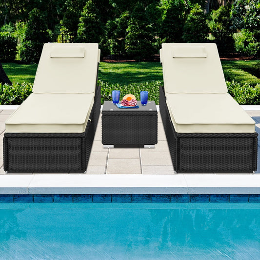 Outdoor Chaise Lounge with Cushions, Seizeen Patio Lounge Chairs Set of 2, All-Weather Rattan Sun Lounger 6 Angles Adjustable, Pool Chair Set with Coffee for Deck Porch Backyard, Beige